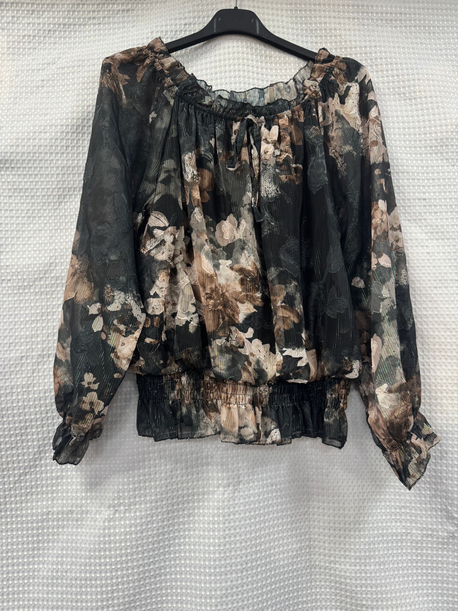 Stylish and trendy print blouse with ruffle elasticated stretch neckline which can be worn on or off the shoulder.