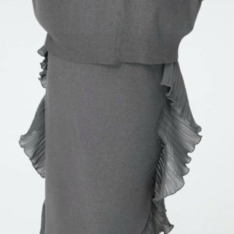 A new season collection A stunning unique two piece set.Features a soft knitted top with a matching knitted skirt. Chiffon frilled edge detail with elasticated waist. Sold in Packs of 2.S/M fits up to a size 14 ukL/XL will fit up to a size 16 ukColours are: beige, grey and black. Viscous elastane blend Made in italyKM222