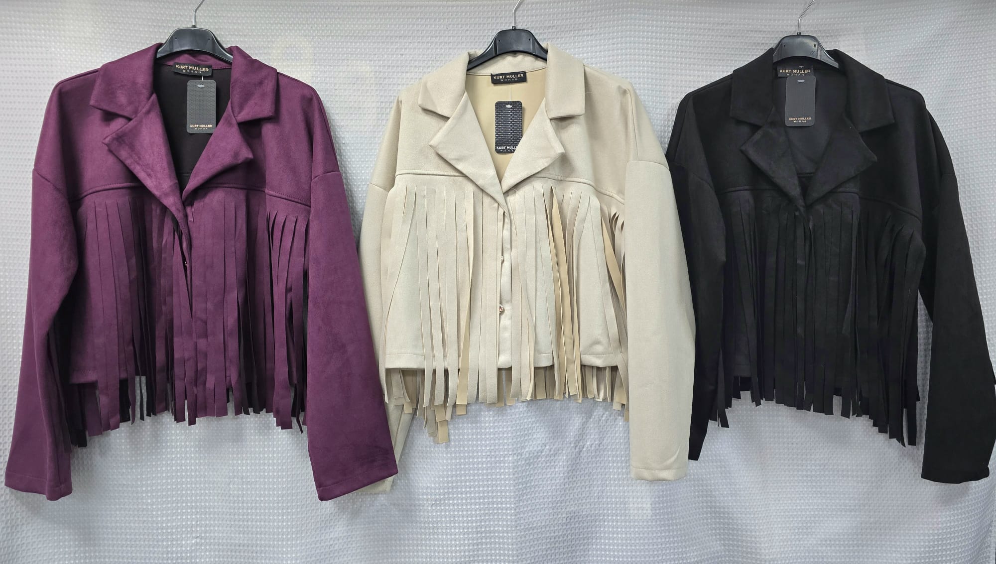 New season collection. Trendy and stylish tassle suedette jacket. Super soft touch. Open collar. Real gold button fastening. Fully lined. One size fits 10-16. Tailored relaxed fit.Colours- wine, chocolate, beige, black, navySoft poly elastane Made in ItalyKM9253