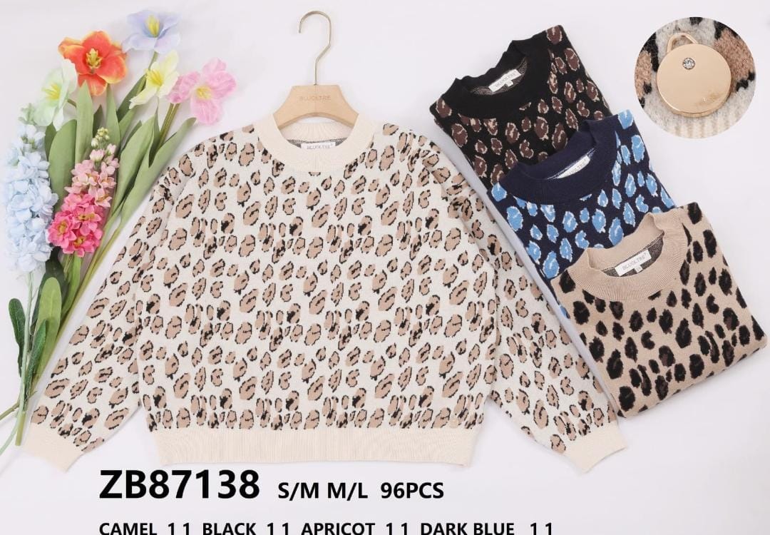 New season arrival.A soft touch luxuroious cashmere feel knit.Crew neck with leopard print design. Slightly cropped relaxed fit. S/M & M/L (fits size 8-16)Sold in mixed col packs of 8 ( 2 of each col)Composition- viscose elastane blendKM87138