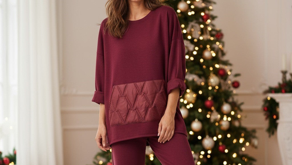 Lounge in style! Trendy and stylish oversized sweatshirt. Super soft scuba fabric with nylon patch detail and roll up sleeves. Crew neck. Made in italy. Sold any colour any quantity. Cols: wine, cream, black, chocolate, navy. Team with matching trousers as a set.KM7500