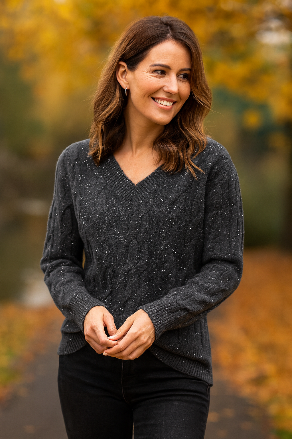 New season arrival.A super soft touch cable knit with sparkle detail. V neck. One size ( fits up to size 16)Sold in mixed colour packs of 10.White 2, charcoal 3, light grey 2, beige 3Viscose wool blendKM86334