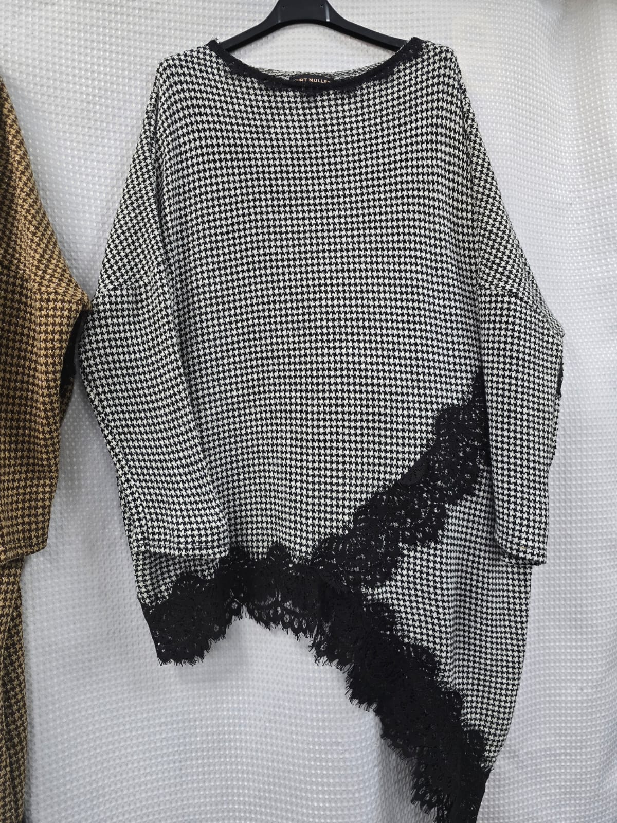 New season arrivals A unique luxury asymmetric Lace hem detail. Check print with subtle lurex detail.Long sleeve top. Stylish and comfortable. Cols- Black and brownOne size fits size 8-20 ukAny quantity any colour elastane viscose blendMade in ItalyKM80370