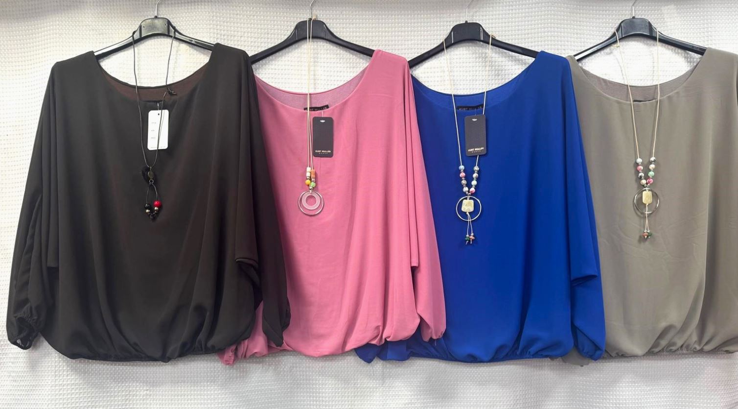 Exclusively by Kurt MullerComes with a multi bead necklaceSimple and stylish. Chiffon crew neck blouse. Fully lined, elasticated bubble hem and long floaty sleeves with elasticated cuffs for extra comfort. Team with leggings or jeans. Perfect for nights out or a casual weekend- can be dressed up or down. Cool and comfy. One size 8-16 UKViscose, polyester, elastaneKM329