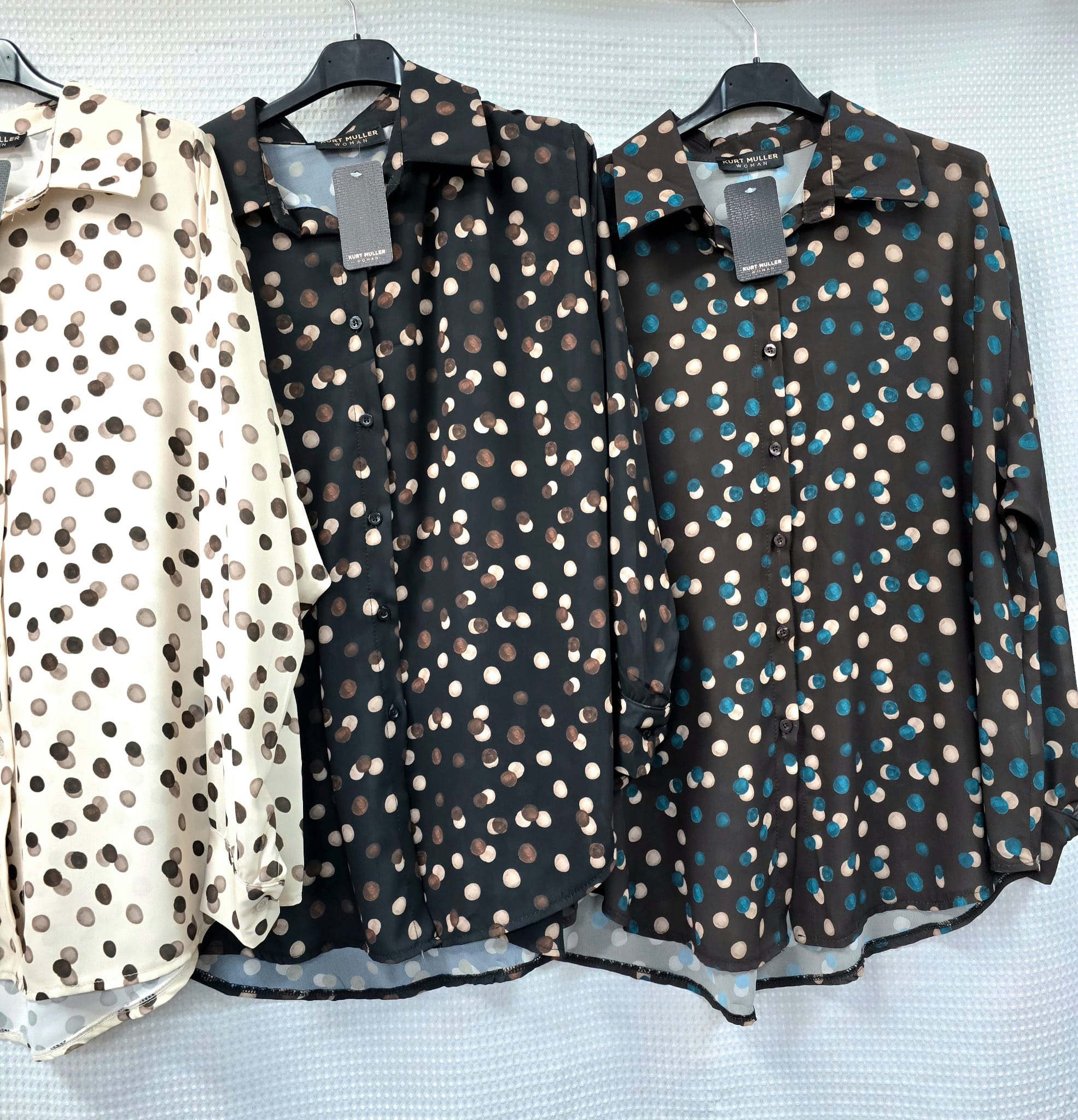 New season arrivals Tonal polka dot print ShirtCollar, button fasteningLong sleeves with button cuffs Trendy and stylish. Team with our jeans or leggingsCurved hemPolyester elastane Made in italyKM91026