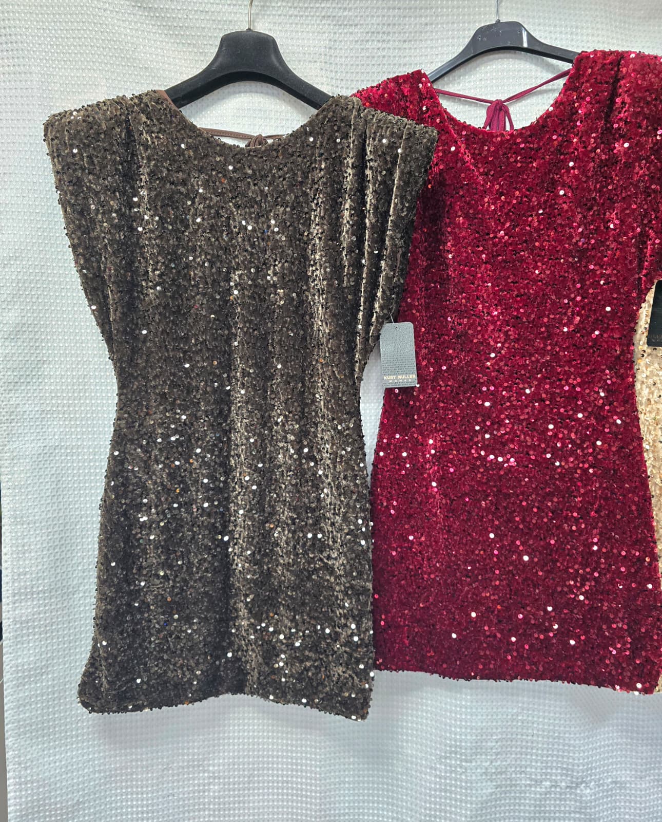 Velvet Sequin mini dress. Tie back fastening with slight open back. Lightly padded shoulders with open short sleeve. Stylish & glamorous yet comfy and flattering. One size fits 8-12uk