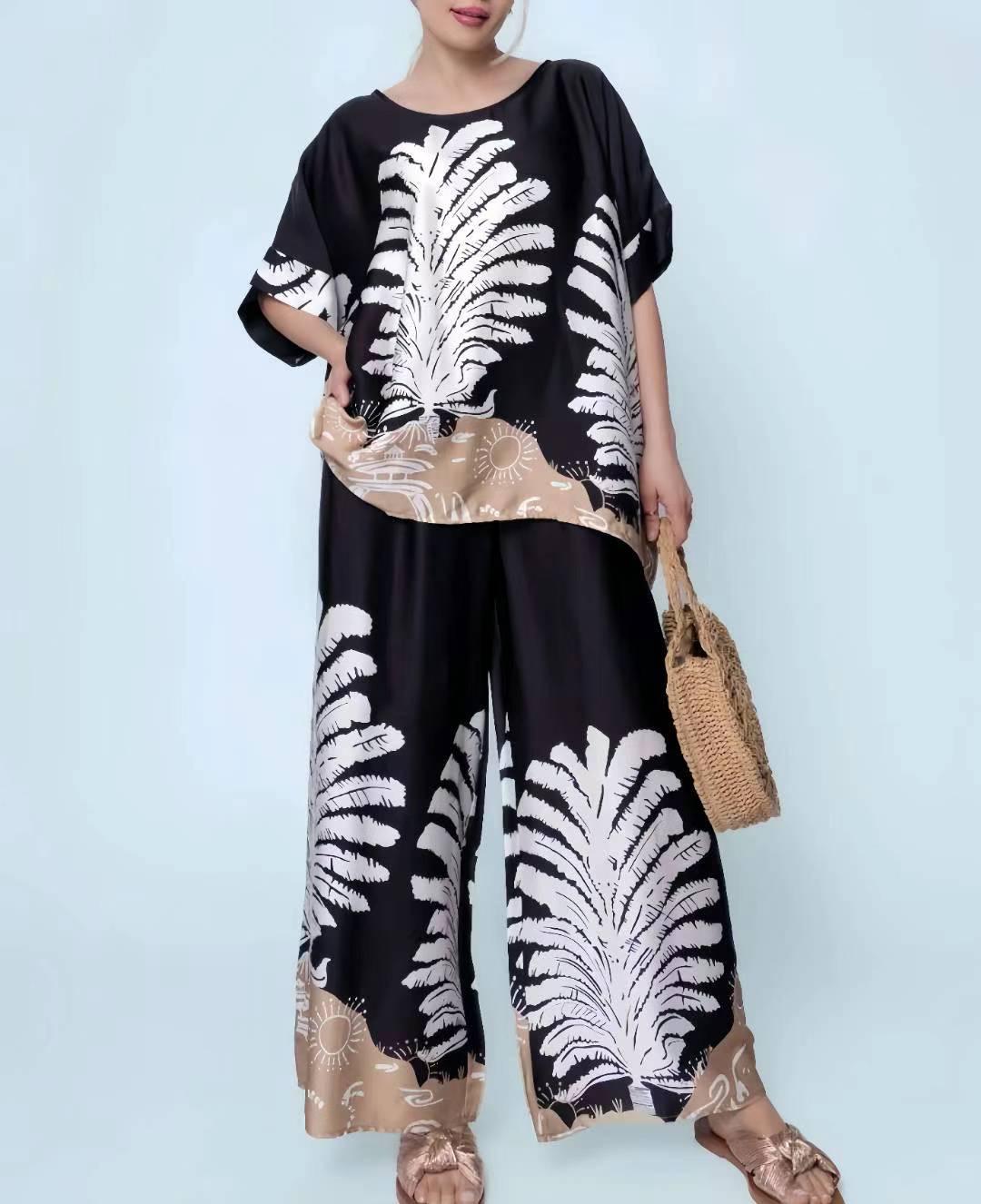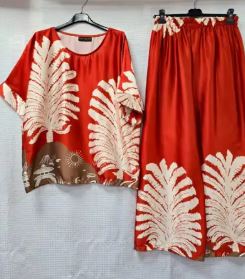 Luxury boutique collection. 2 Piece set. Sateen top with matching trousers with elasticated waist and wide leg. Digital print. One size ( fits up to size 18)Sold in any col any qtys. 100% polyester