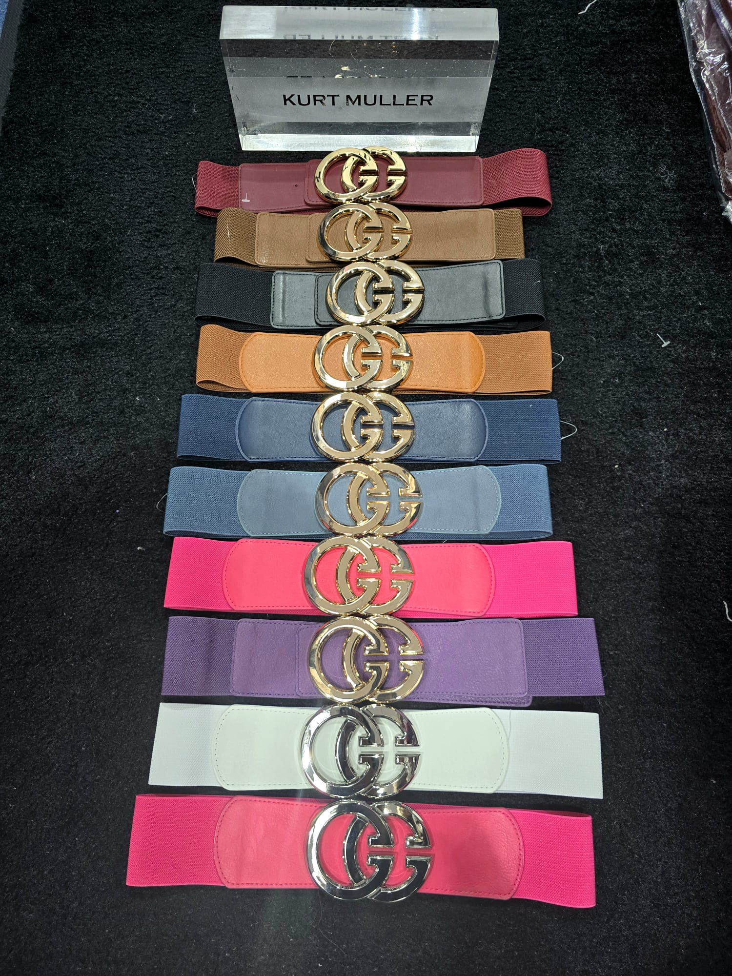 • GG Buckle wide elasticated belts with vegan leather front strip